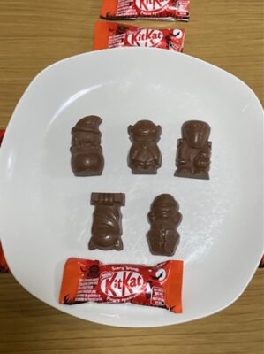 ハロウィンにモンスターチョコ チョコの中でもキットカット大好き そして見つけました キットカットのハロウィン仕様 ドラキュラやフランケン、ミイラなどなど 言葉だけで聞くと食べる気しませんが写真を見ると可愛い~ 中身はこんな感じでキットカットと言っても普段食べている ウェハースが層になっているものではなく中に練りこまれている感じです。 子供たちにも喜ばれ、何が出るかなと楽しく頂きました ★ランキング応援をお願いします★