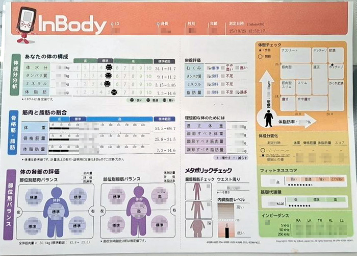 インボディー測定では、体成分分析装置で体の成分である体水分・タンパク質・ミネラル・体脂肪などを測定することができました