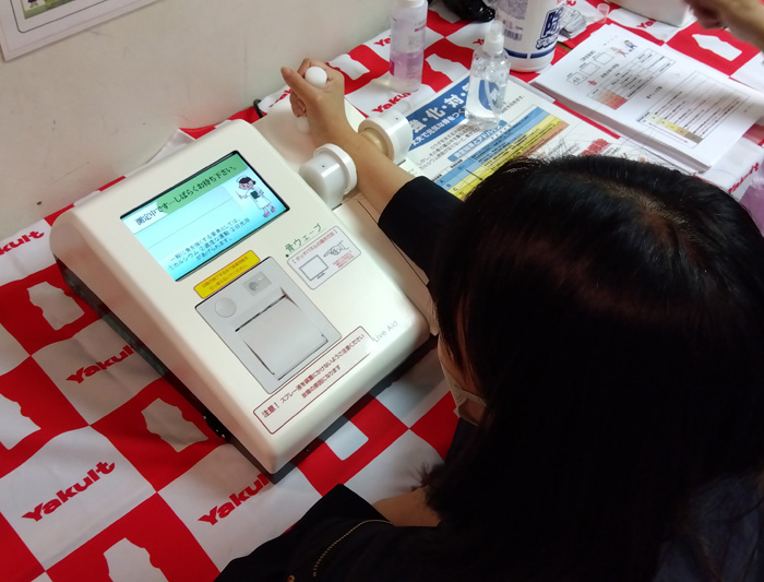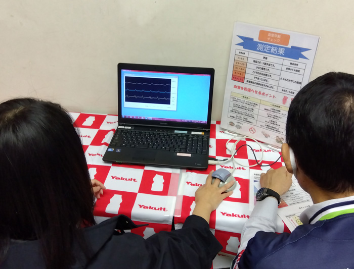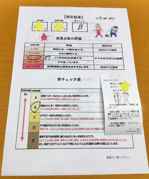骨密度・血管年齢測定では、2種類の機械を使って血管点数の評価と骨チェックをしていただきました