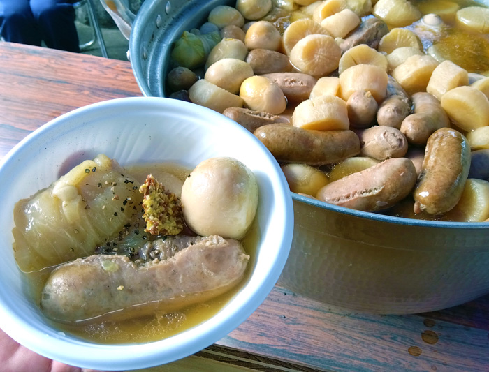 あたたかくてお出汁の効いた香寺そばや具だくさんのポトフ、カレーライスやフランクフルト、コロッケ、唐揚げ、ぜんざい、プリンなどさまざまなものが並んでおり、どれも美味しそうでどれを食べようか悩みます
