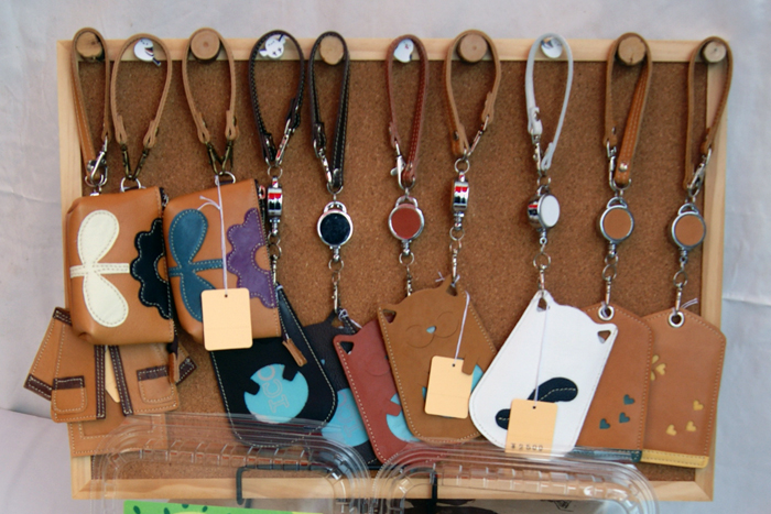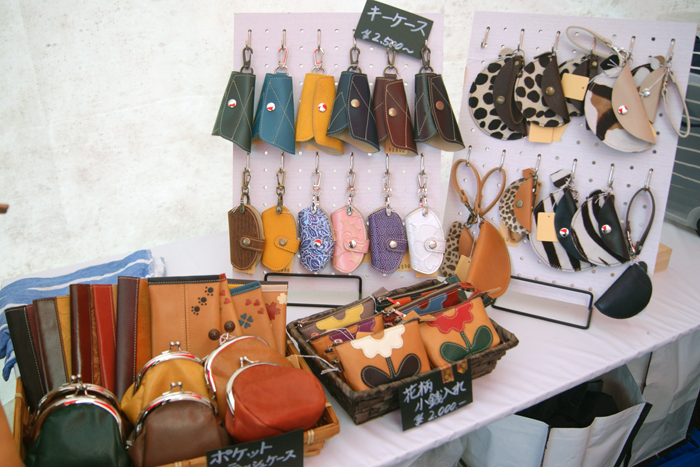 色とりどりのバッグやキーケース、小銭入れ、ディッシュケース、パスケースなどが姫路の皮革で作られた商品が並びます![]()