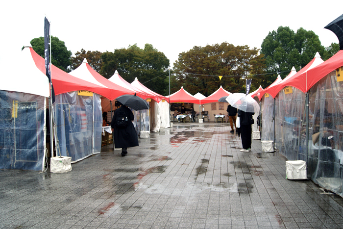 各ブースでは、天気の日には見られないビニールでブースを覆い雨対策しながらイベントが行われていましたよ。