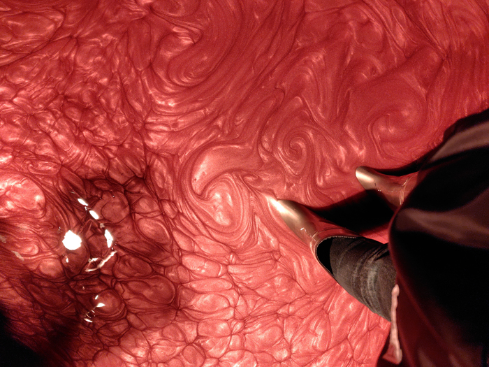 長靴を履いて、個室空間に閉じ込められ、チョコレートみたいな液体の中へ。
