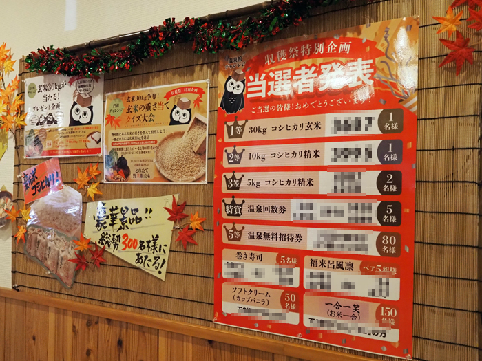 収穫祭特別企画「温泉チャレンジ!プレゼント企画」は、2025年11月1日(土)~29日(土)の期間中に入湯された方に、抽選券を1枚進呈し、1等「コシヒカリ玄米30kg」、2等「コシヒカリ精米10kg」、3等「コシヒカリ精米3kg」などの他豪華賞品が当たるというもの。