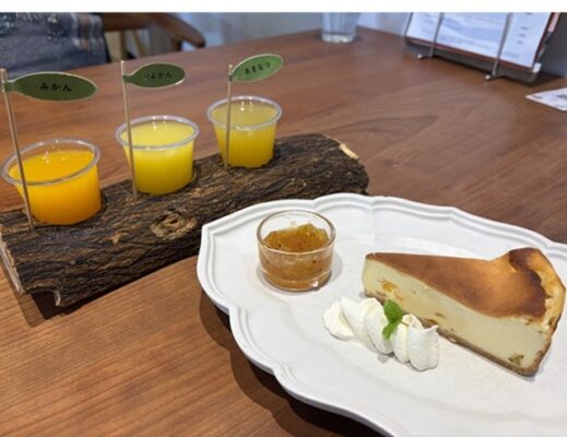 6種類の中から3種の飲み比べみかんジュースとみかんを使ったチーズケーキ。ポンカンだったかな?みかんのジャムを添えて![]()
